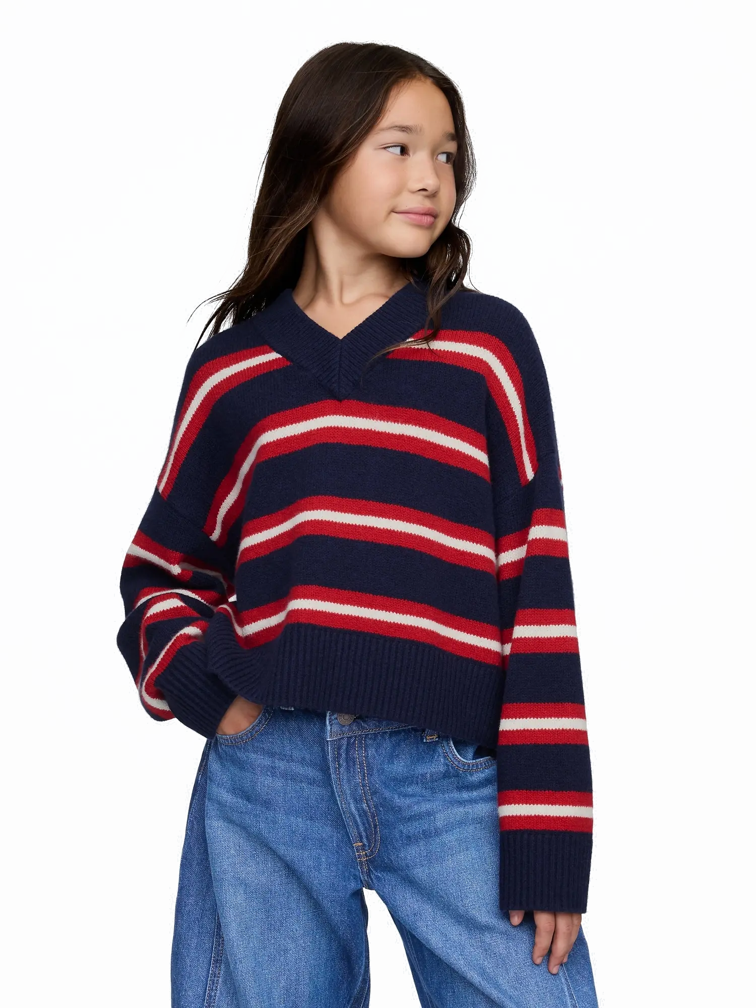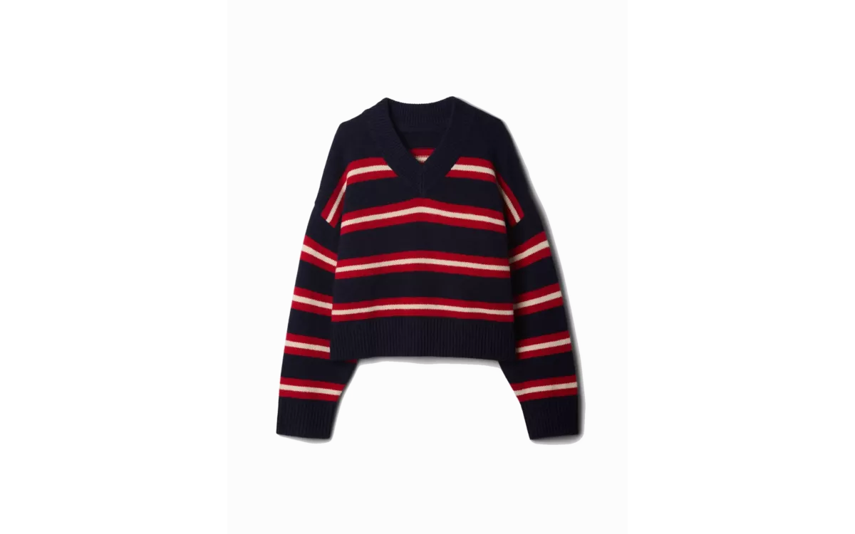 - Stílusos V-nyakú kivágás, hosszú ujjú és bordázott alsó.