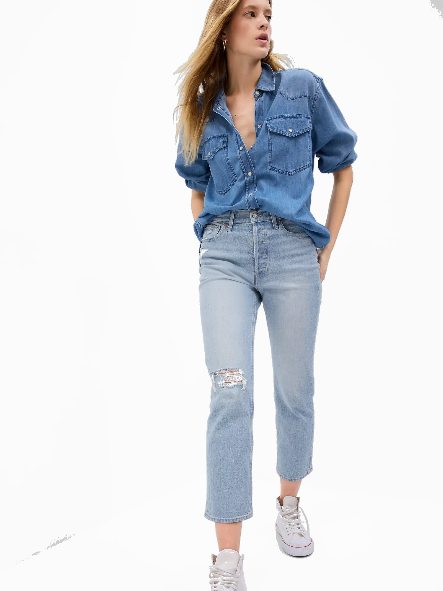 - A farmernadrágok tökéletesen formálják a csípőt, erősen tartják a derekat, és stílusos, egyszerű szárakkal végződnek a bokánál.