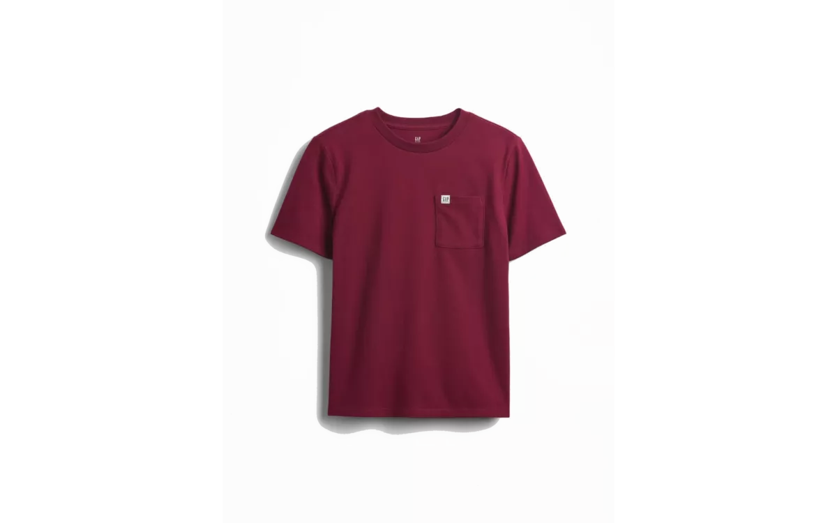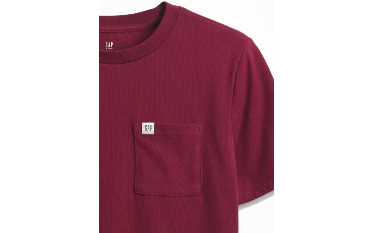 - A fiúknak szánt, puha pamutból készült póló zsebbel és a Gap logójával, amely a hétköznapi viselethez ideális a kényelme miatt.